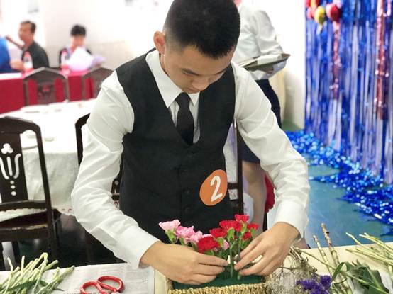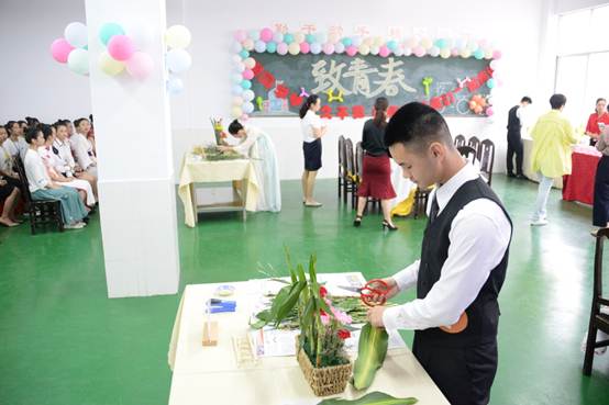 大赛经初赛、复赛,最终彭郴等12位同学脱颖而出进入决赛, “致青春”中餐主题宴会摆台基于典型的工作过程和真实聚会场景要求,比赛现场,选手们沉着应战,小心翼翼地摆放餐具和装饰物,将所学技能一一展现。在一双双巧手的装扮下,“风华正茂”、“扶摇直上”、“大展鸿图”、“匠心筑梦”、“出类拔萃”、“峥嵘岁月”等精心设计的主题宴会作品一一呈现。最后,彭郴和曾嘉欣同学的主题作品“扶摇直上”勇夺桂冠。