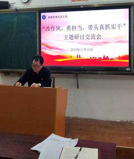 11月15日下午,旅游管理系党支部在教学楼408教室召开以“改作风、勇担当,带头真抓实干”为主题的专题研讨交流会。研讨交流会由党支部书记黄亚平同志主持并讲话,全体党员和入党积极分子参加。