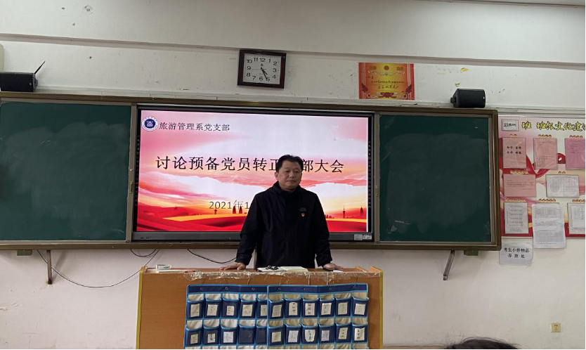 (旅游管理系党支部讯 通讯员 张梦)2021年11月11日下午,旅游管理系党支部在教学楼406教室召开讨论预备党员转正支部大会。会议由支部书记黄亚平主持,系部6名正式党员、4名预备党员及1名入党积极分子参加会议,共同见证这一庄严而神圣的时刻。