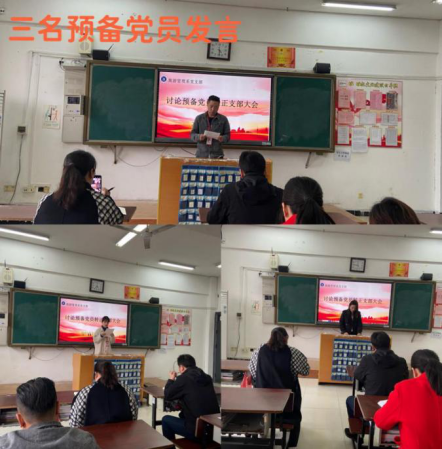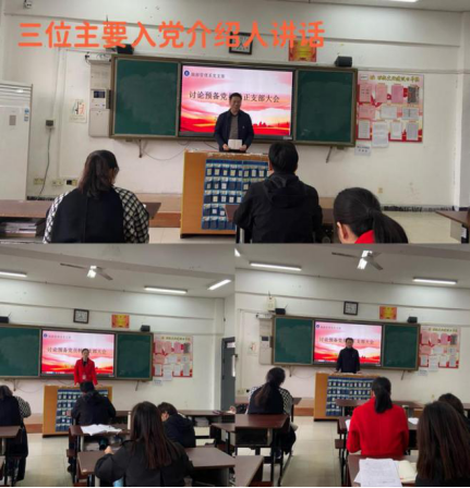 会议首先审议了预备党员王冠寻、彭琦雅和张潇予三位同志转为正式中共党员的申请。三名预备党员依次围绕一年来对党的认识、思想和工作情况向大会做了汇报,总结了预备期间在思想政治方面、学习上、生活上在党组织培养下取得的进步和不足,表达了转为中共正式党员的强烈意愿。接下来,三位预备党员的入党介绍人江东洋同志、刘艳花同志和黄亚平同志分别介绍了预备党员在考察期的基本情况,表明了同意其按期转正的意见。