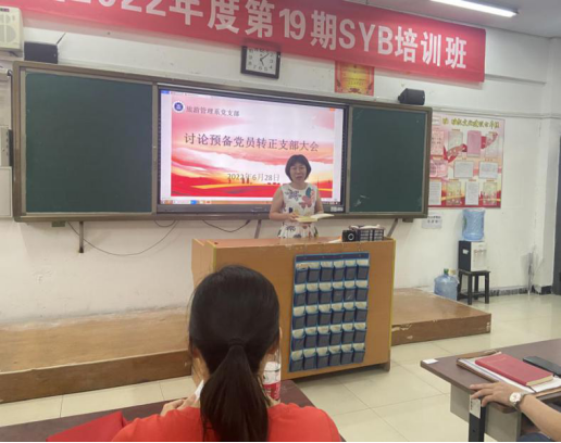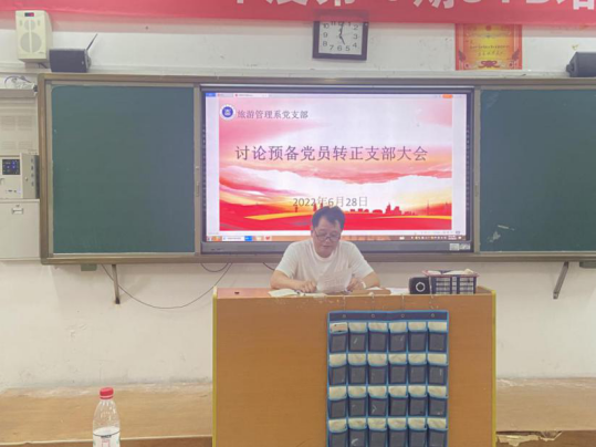 (通讯员 张梦)为做好基层党建工作,充实党支部队伍,进一步坚定新党员理想信念,激发新党员使命感、责任感和自豪感,2022年6月28日下午,旅游管理系党支部在教学楼406教室召开预备党员转正会议。会议由支部组织委员刘艳花主持,系部11名正式党员、2名预备党员及2名入党积极分子参加会议,共同见证这一庄严而神圣的时刻。