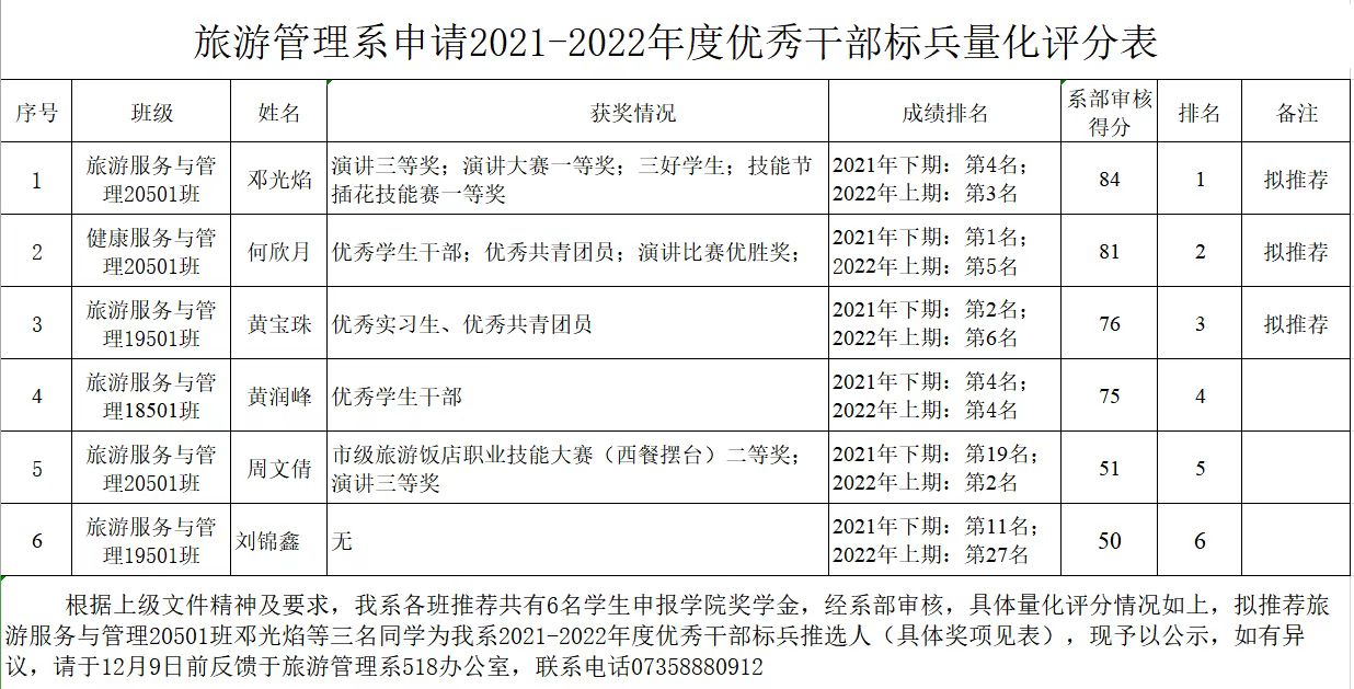 旅游管理系拟推荐2021-2022年度学院奖学金、优秀干部标兵公示名单