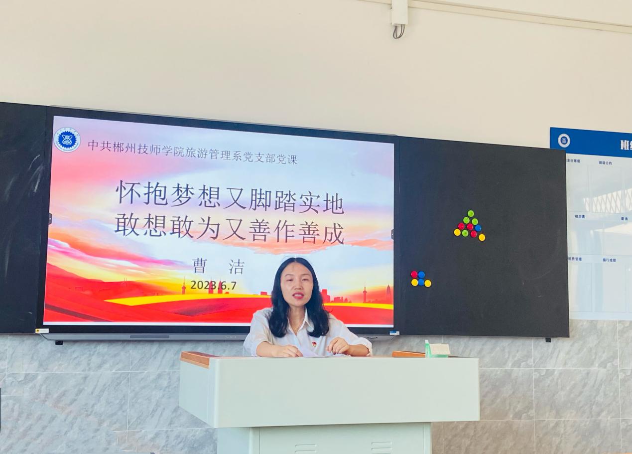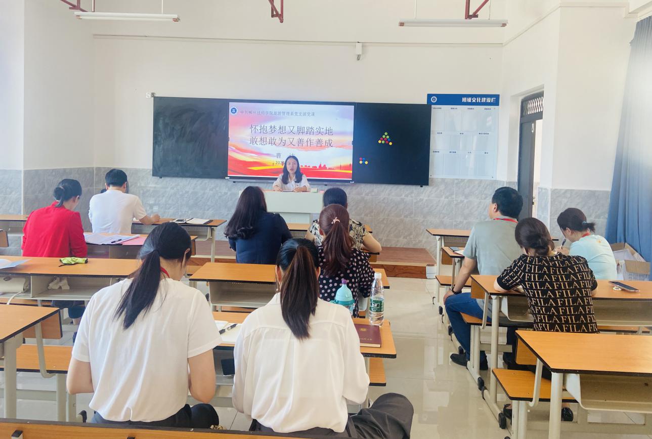 (通讯员 张梦) 6月7日下午,旅游管理系党支部在图书馆1106教室开展“一课一片一实践”主题党日活动,活动由党支部书记黄亚平主持,院党委委员、宣传统战部部长曹洁以普通党员身份参加活动,并为支部党员讲授以《怀抱梦想又脚踏实地,敢想敢为又善作善战》为主题的微党课,支部全体党员参加会议。