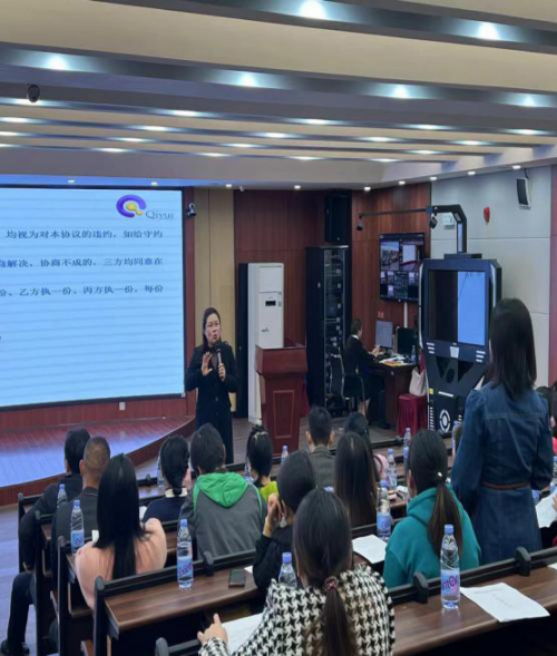 广州启誉企业管理顾问有限公司总经理谭巧玲、福州恩雅美容服务有限公司总经理曹兰茵分别就企业情况、强训教学安排、实习教学、实习安置、学生安全管理、三方协议等做了解读,并现场答疑。