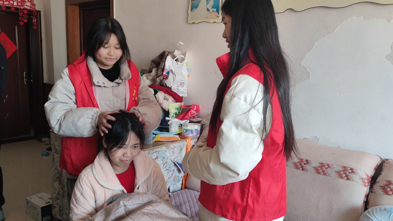 12月22日下午,旅游管理系党支部宣传委员张梦、团总支书记徐静和王珞琪老师带领11名学生进入上白水社区进行社区孤寡老人、残疾人慰问活动。社区书记邓见红告诉我们,这次慰问的3户人家都非常困难。当我们走进一户人家时,受到了阿姨热情的迎接,阿姨眼里噙满泪水,感激之情难以掩饰。美容23302班龙含露、兰佳同学还特意为阿姨进行了舒缓按摩。