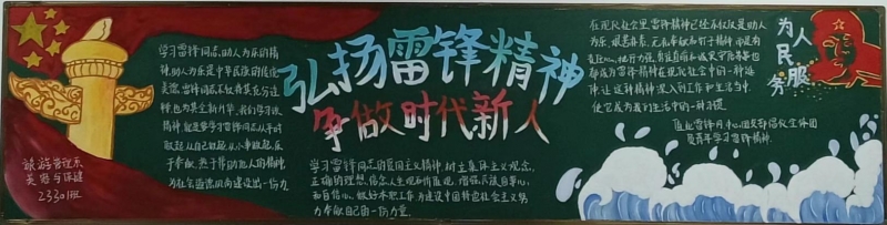 (通讯员 张梦)为弘扬雷锋无私奉献的精神,鼓励当代青年学习和传承雷锋精神,展现郴州技师学院学子们蓬勃向上的精神风貌。三月份学院开展了以“弘扬雷锋精神,争做时代新人”为主题的黑板报评比活动。