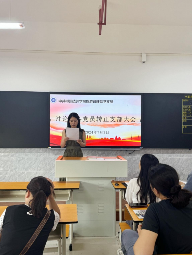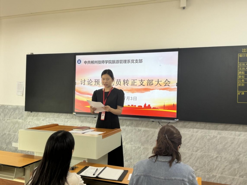 (通讯员 张梦)为进一步加强党员队伍建设,增强党员队伍生机与活力,根据支部发展党员工作计划,2024年7月3日,旅游管理系党支部在图书馆806教室召开预备党员王程敏同志的转正大会。会议由支部副书记马欣同志主持,支部全体党员、预备党员及入党积极分子参加会议。