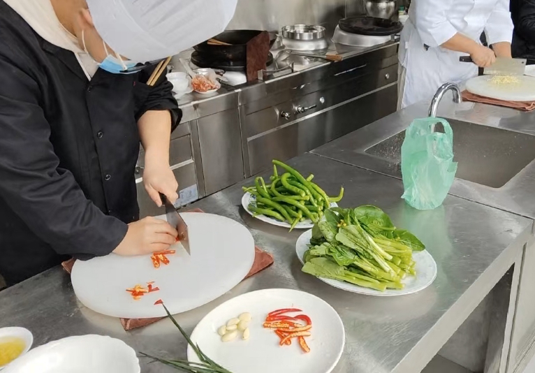烹饪竞赛赛场内,犹如一个厨艺“江湖”,各路“豪杰”尽显神通。赛台上,摆放着新鲜的食材,从鲜嫩水灵的蔬菜,到活蹦乱跳的鱼虾,再到色泽红润的肉类,它们即将在选手们的手中完成一场华丽“变身”。只见参赛的同学们手持菜刀,神情专注,手中的刀在案板上轻快舞动,切丝如发、切片匀薄、切块规整,每一刀都蕴含着平日里刻苦练习的功底,“哒哒哒”的切菜声节奏明快,让人不禁联想到古代庖丁解牛时的游刃有余。
