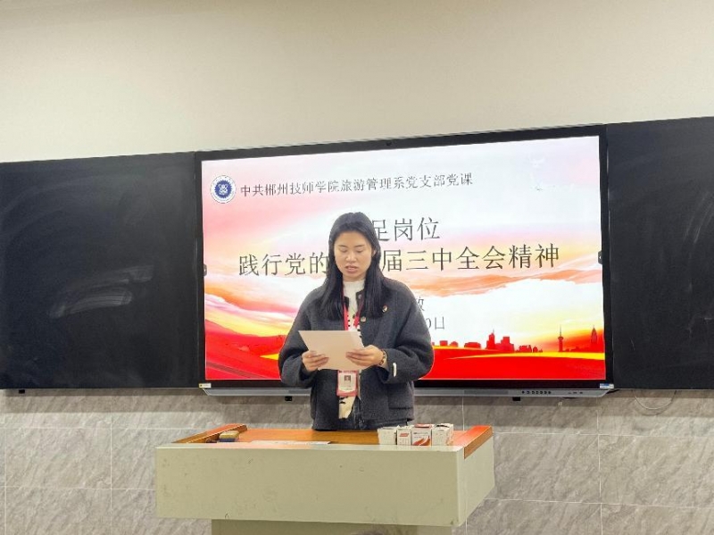 (通讯员 张梦)为深入学习贯彻党的二十届三中全会精神,推动系部工作高质量发展,12月30日,旅游管理系党支部在图书馆1004教室组织开展了学习党的二十届三中全会精神主题党日活动,旅游管理系党支部全体党员(含预备党员)及入党积极分子参加活动,活动由党支部副书记马欣主持。
