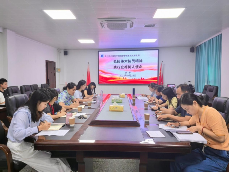 (通讯员 张梦)为纪念中国人民抗日战争暨世界反法西斯战争胜利80周年,大力弘扬伟大抗战精神,9月29日下午,旅游管理系党支部在综合楼一号会议室开展了以“弘扬抗战精神,汲取奋进力量”为主题的“一月一课一片一实践”主题党日活动。此次活动由党支部书记马欣主持,旅游管理系党支部全体党员及入党积极分子参加。