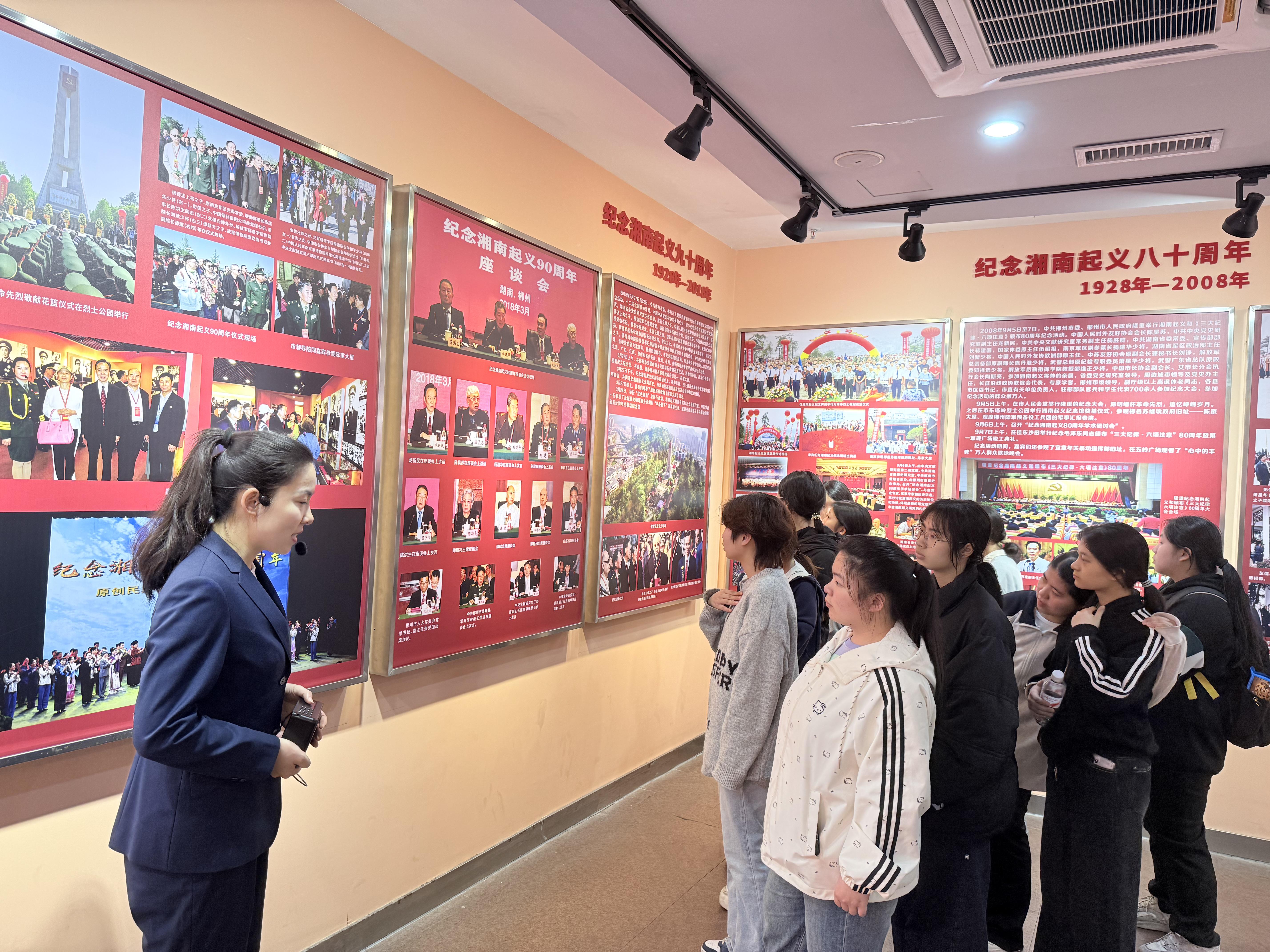 湘南起义纪念馆是省级爱国主义教育基地,馆内设有五大专题展陈、十四个展厅,生动再现了那段波澜壮阔的革命历程。在讲解员的带领下,师生们深入了解湘南起义的历史背景与经过,认真聆听革命先烈的英勇事迹。大家驻足凝视珍贵文物与历史图片,深切感悟到先辈们为民族独立和人民解放不惜牺牲生命的崇高精神。