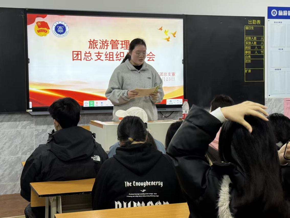 会议第二项,旅游管理系团总支书记何娟发表讲话。她结合当前共青团工作的总体要求与系部实际,勉励广大团员青年要勇于自我革命,敢于直面问题,持续提升自身综合素质。她强调,团员不仅要在组织上入团,更要在思想上、行动上真正成为青年中的表率,争做有理想、敢担当、能吃苦、肯奋斗的新时代好青年。